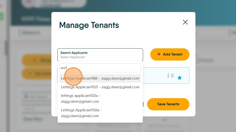 18. Click "Select Applicant" from the search field find and select the previously created record. (e.g. the applicant is already a pre-booked tenant or applicant record in CRM)