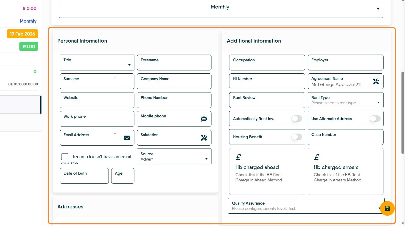 22. In the (blank) Tenant record scroll down and complete all the personal data that is required.